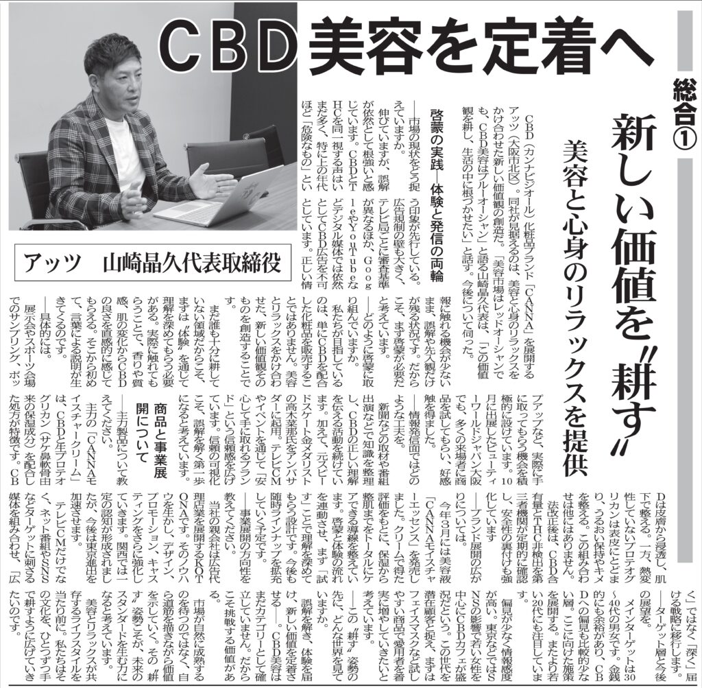 記事では、CBDを活用した美容分野での取り組みや、今後の事業展開について紹介されています。